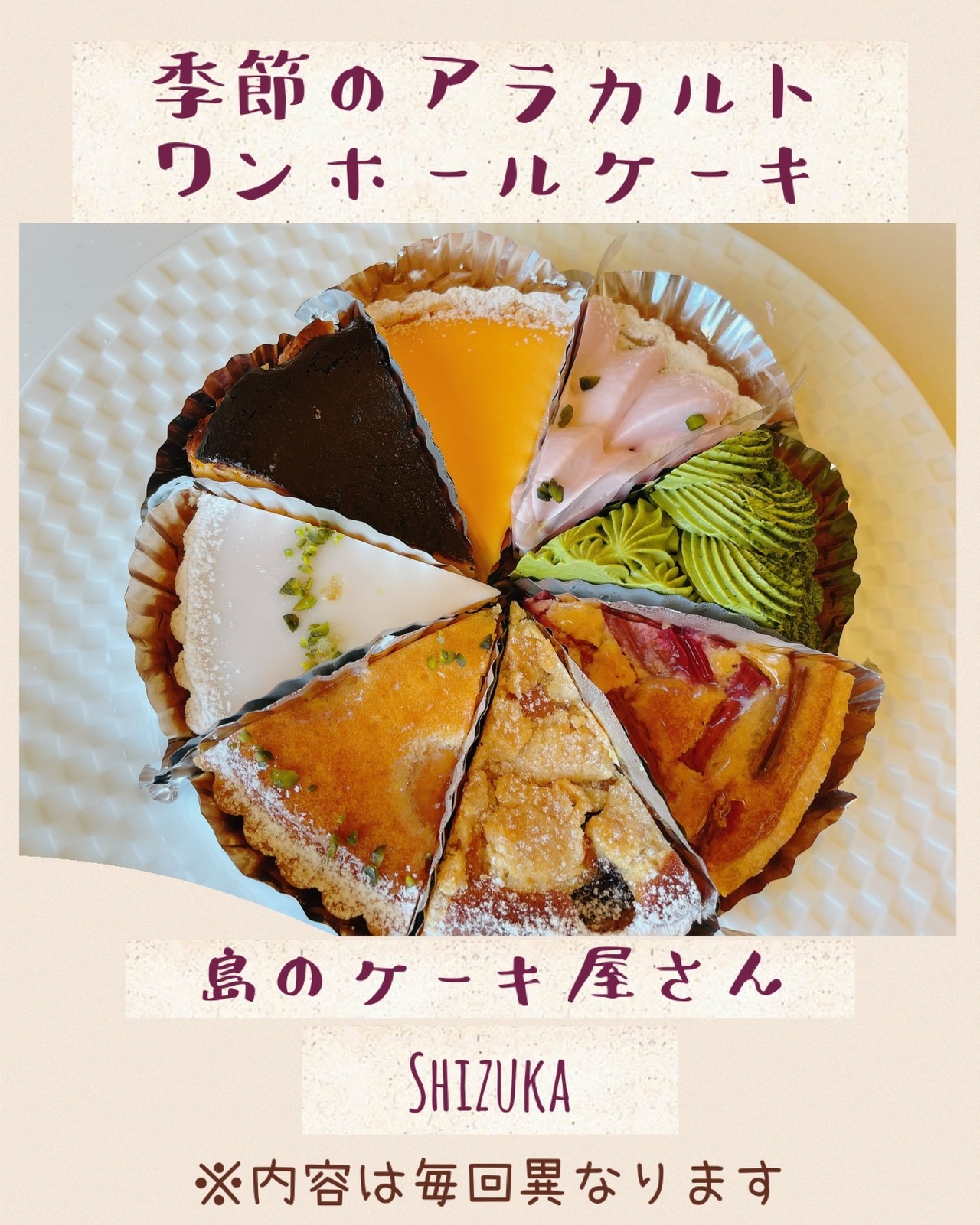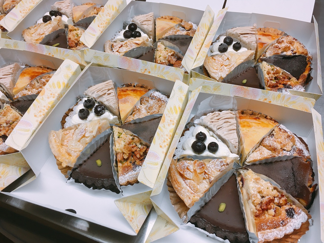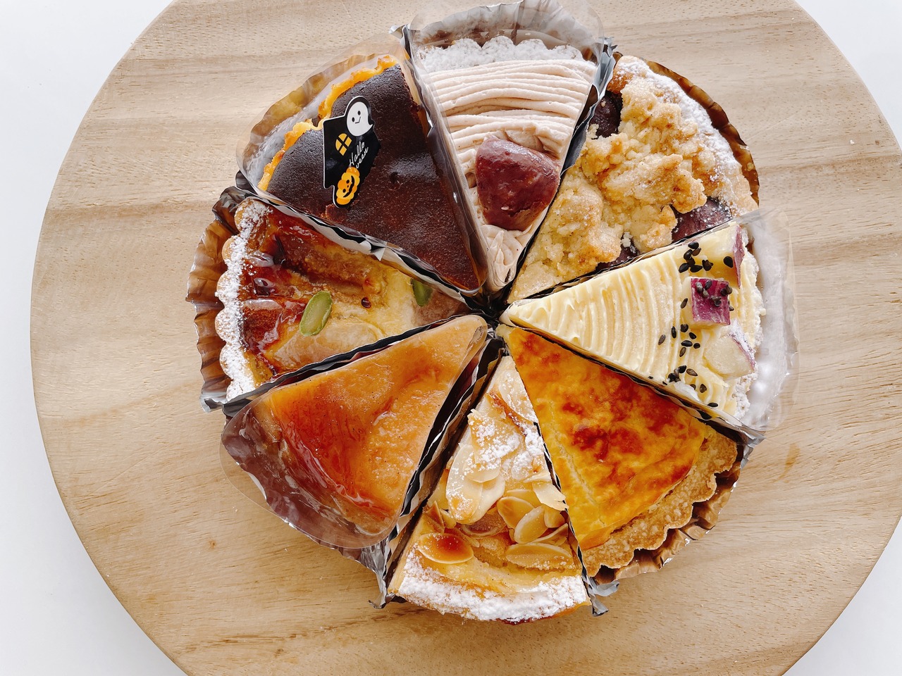 季節のケーキ(主にタルト)5号サイズ(16センチ)の1/8カットを8種類でワンホール。