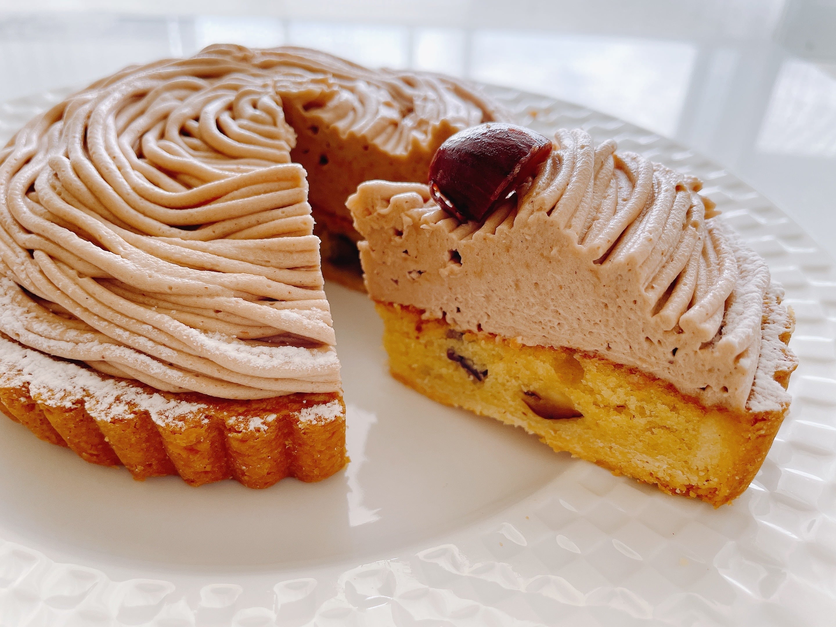 上にはフランス産のマロンペースト(アンベール)を使用した口溶け良いクリームをモンブラン風に絞り、