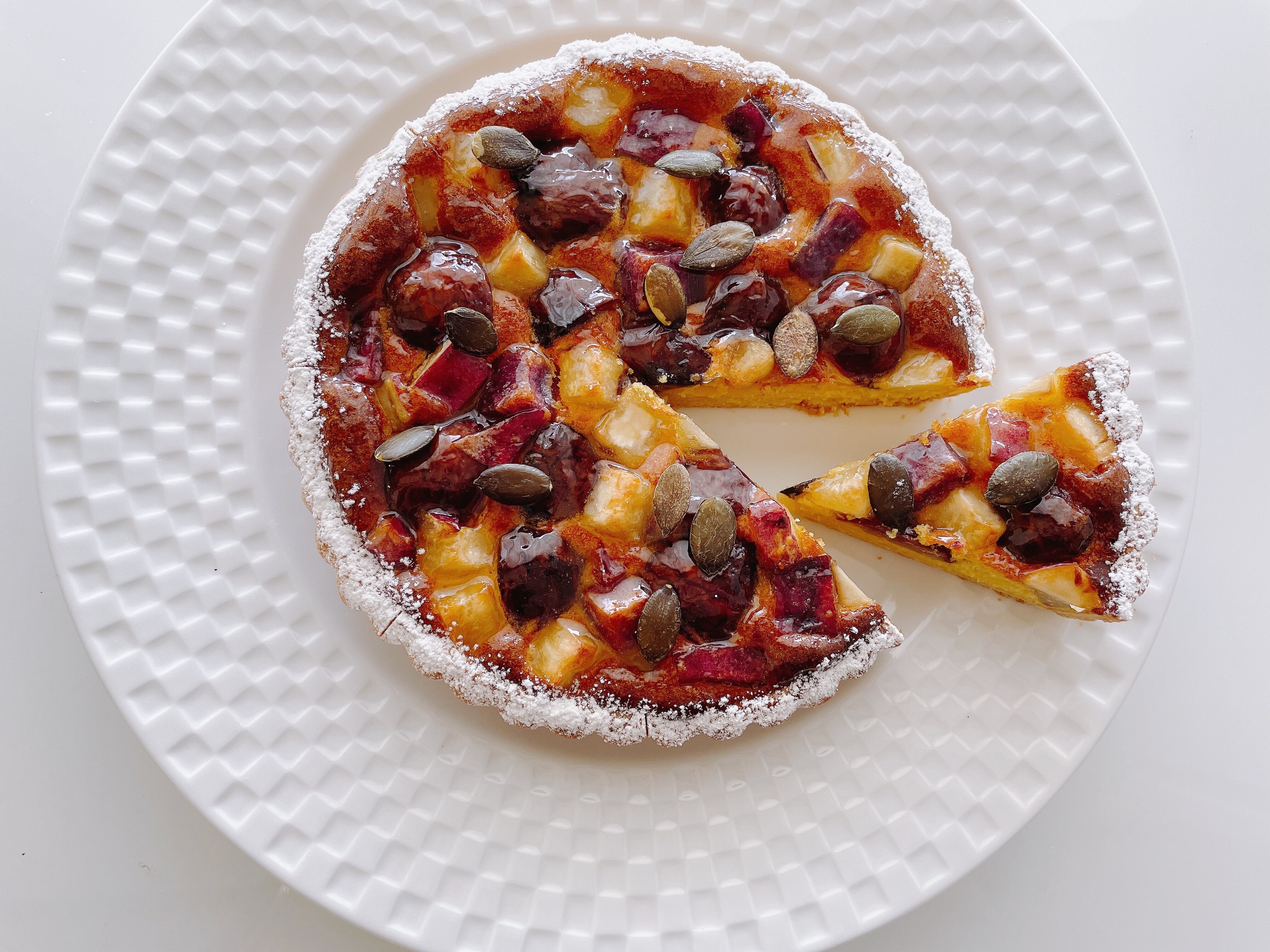 栗の渋皮煮をトッピングして焼き込んだ秋らしいタルト。