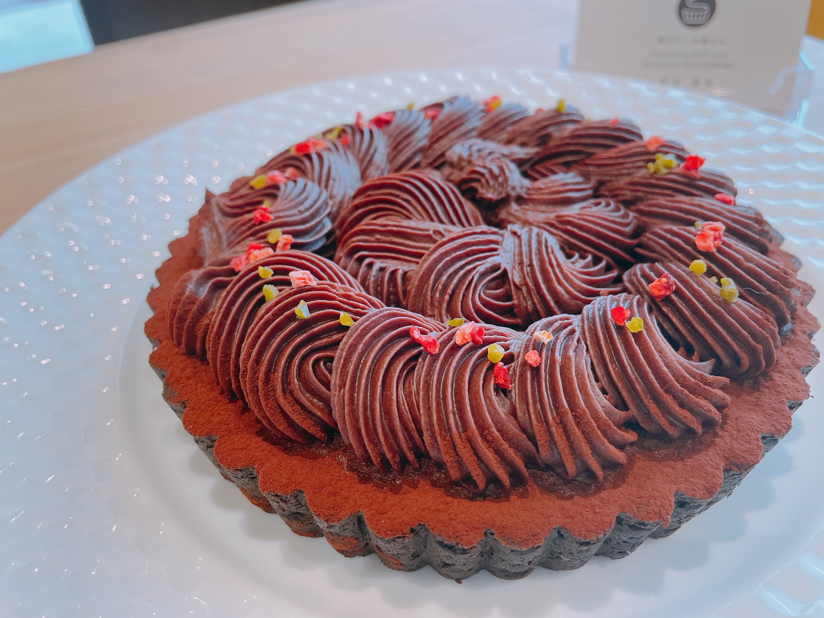 サクサクタルト生地に、ショコラアーモンドクリーム。そしてラズベリーのガナッシュ(生チョコ)をたっぷりと絞った、チョコ好きにはたまらないタルト