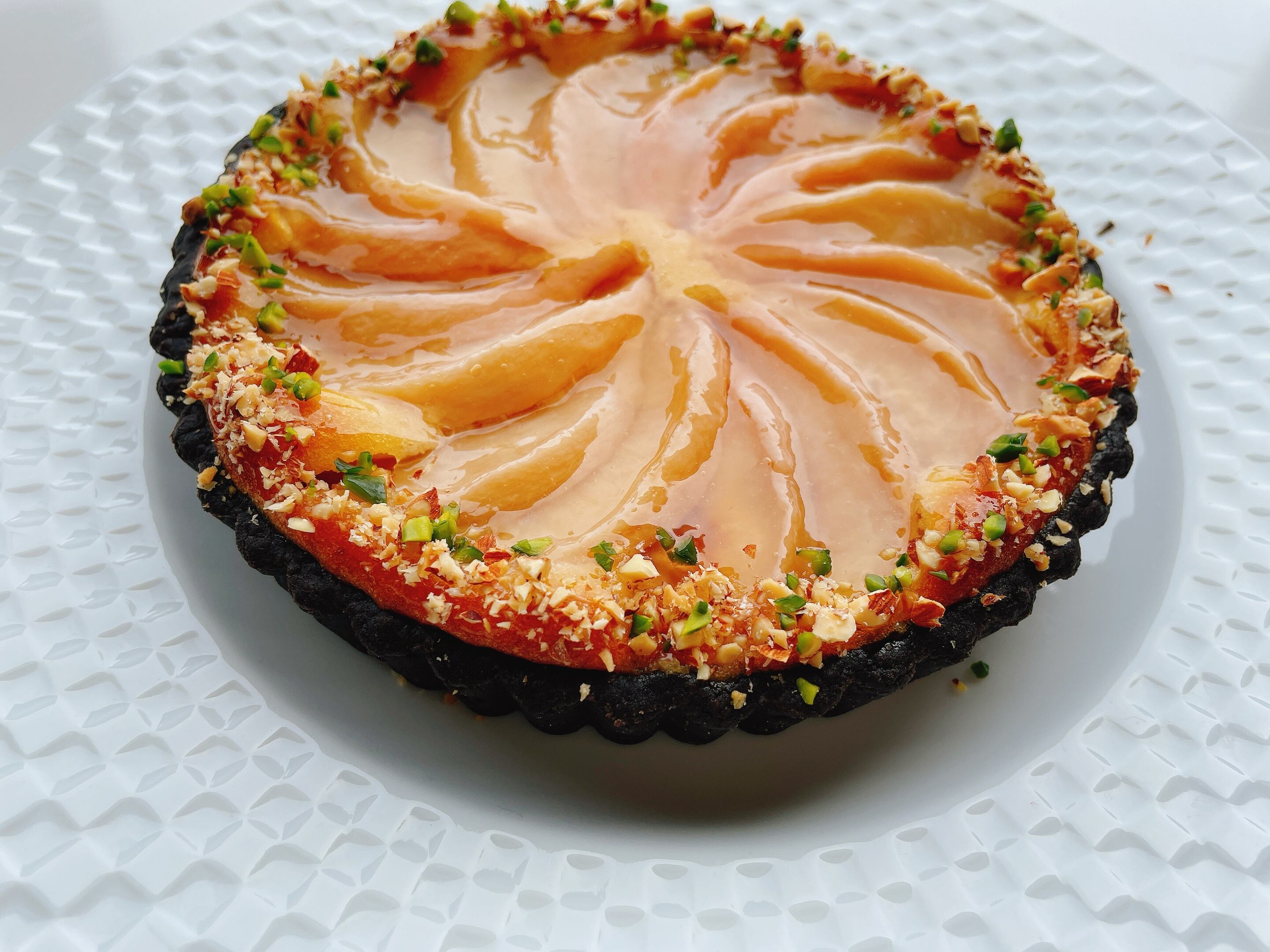 生クリームを加えたアーモンドクリームと一緒に焼き上げました。桃のコンポート果汁がアーモンドの生地に染み込み、ジュワッと広がる美味しさ。ちょっとビターなショコラタルト生地が甘さを引き締めている様。